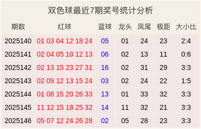 上期双色球的开奖号码中,龙头凤尾组合为05+28,极距为23,大小比为3:3。